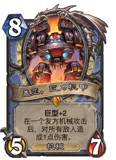 簡評:衍生物42突襲聖盾攻擊後過牌,本體可以先攻擊探底,然後衍生物攻擊抽牌,相當於定向檢索本身還是機械,身材合理,解場的同時還可以過牌,相當靈活的一張巨型怪。