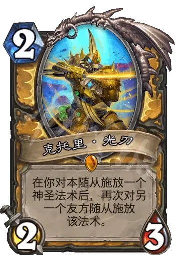 簡評:卡面很帥,身材也合理,效果靈活,騎士神聖法術buff也很多,也可以複製聖契等高質量法術來配合站場。