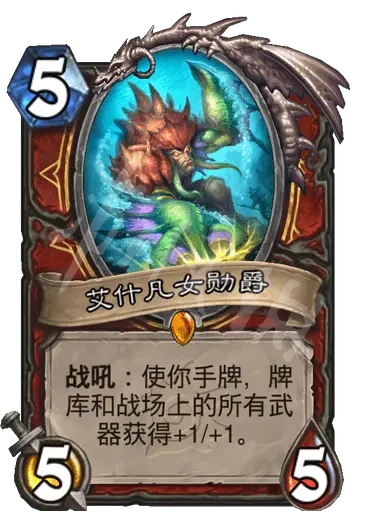 簡評:衍生物有突襲可以解場,亡語武器砍一刀,另一個衍生物再攻擊還可以留一把刀,而且本體可以給刀加攻,身材合理,非常優秀的一張節奏卡。