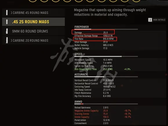 重點關注兩個數據,一個是威力,另一個就是射速。這兩個數據直接決定了我們的TTK!