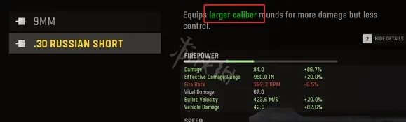 需要注意的是,出於季前賽平衡的考慮,大口徑彈葯和“咽喉要地”特長沖突,並不會生效。在配件描述中會被綠色字體標出來,中文表述為“較大口徑”“口徑大很多”。