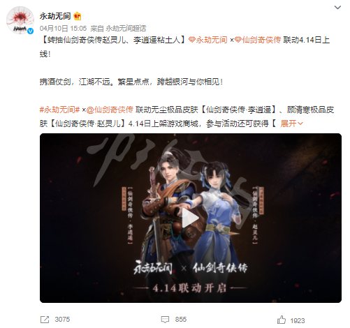 4月10日, 永劫無間 官方發博表示:攜酒仗劍,江湖不遠。繁星點點,跨越銀河與你相見! 永劫無間 與 仙劍奇俠傳 展開聯動活動,將於4月14日上線。