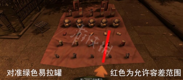 打開游戲來到套圈小販處,將箭頭對準需要套的酒瓶,紅色為允許的容差範圍,蓄力到一半的地方就是我們可以套到邊上兩個酒瓶的力量,中間的三個就需要我們逐漸減少力量。