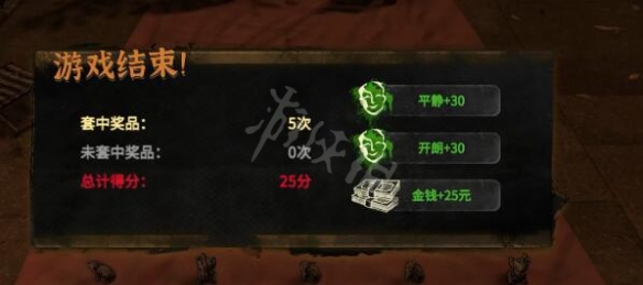 當我們在一局套圈游戲中完成對酒的五次套正,我們可以獲得25元、30點平靜值以及30點開朗值。