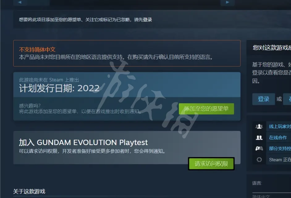 獲得美服/加拿大服賬號之後,登錄上steam商店,查找Gundam Evolution,在詳情頁面中可以看到請求訪問,點擊後等待官方發放資格。