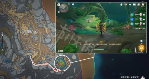 如果有旅行者還是找不到的話,可以看一下我下面的實地場景截圖,首先來到巨淵主礦區南邊的傳送錨點,之後往東南方向看,沿著山側走到山洞入口: