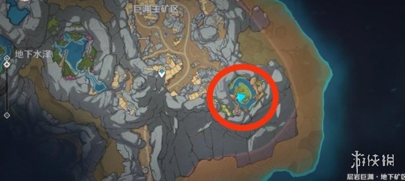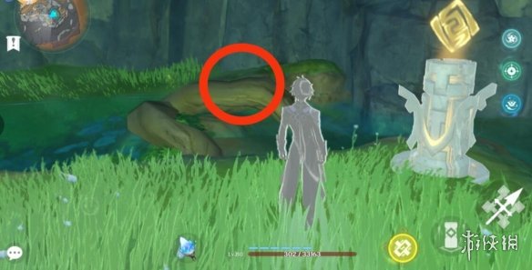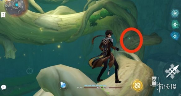 鏡頭轉向離岩元素方碑最近的枝幹,打開元素視野,可看到枝幹上有一綠色光點,如圖所示。(我這里已經解鎖了,所以看不到,位置在圖中圓圈處)靠近之後觸摸即可。