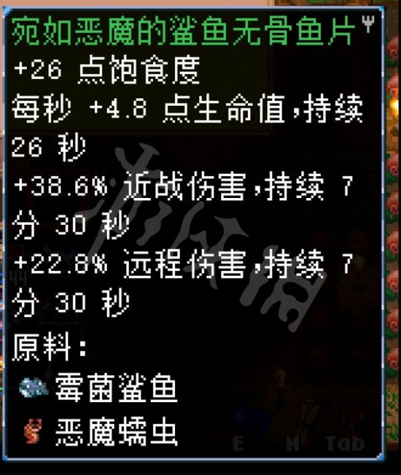 原料是黴菌地釣的鯊魚和黏土區釣的惡魔蠕蟲,這里惡魔鰻魚很難釣,釣魚方法是拉1.5放1.5接拉1放1。