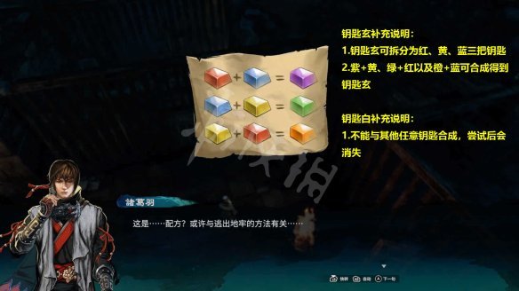 在工作台放上已經獲得的兩把鑰匙合成得到【鑰匙·紫】,用新鑰匙打開牢門觸發劇情。
