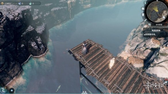 藏寶圖2所示地點在狼背崖,從礦坑內部出來自動到達,可順帶探索,在如圖所示的位置釣魚即可獲得湖中寶箱,打開寶箱獲得殘頁上篇。