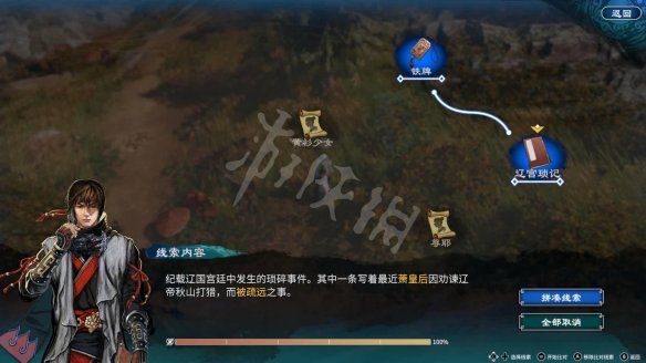 進入思考階段,將【鐵牌】和【遼宮瑣記】結合,分析時選擇【背面】,獲得情報【蕭皇後】。