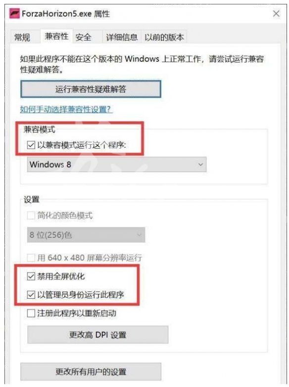 1、開啟兼容模式,禁用全屏優化以及管理員模式。
