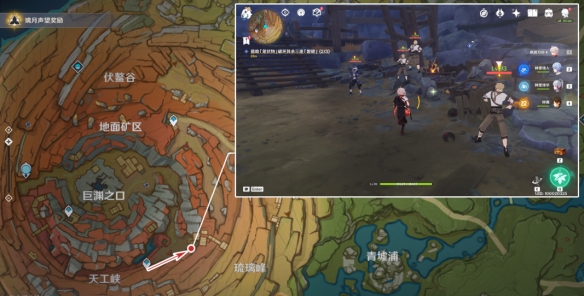 在下圖所示位置,我們會遇到一夥盜寶團,將他們全部擊敗後才發現,這竟是一支偽裝成盜寶團的千岩軍,經過一段時間的暗中調查,現在萬事俱備,只欠總攻。沒辦法,誰讓我們打錯人了呢,只好一起去幫他們一鍋端了。