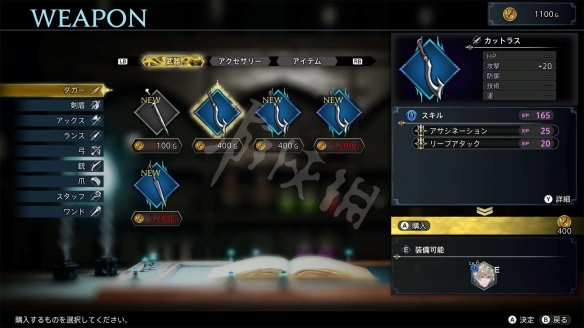 能夠在商店購買,或是使用原料開發武器。武器上有設定技能,每個角色能夠裝備的武器也會有所不同。