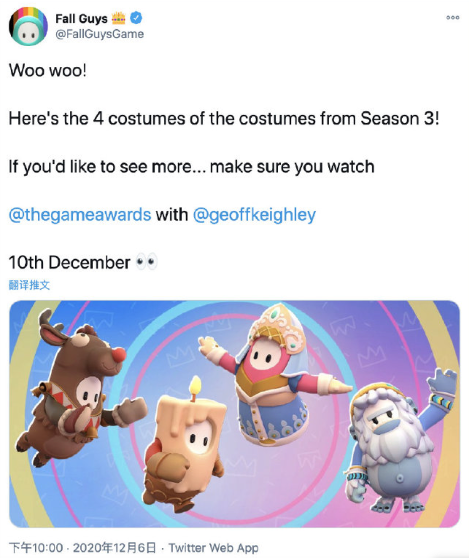 糖豆人官方推特公布新賽季的四款全新角色皮膚,這四款皮膚均包含了聖誕主題內容。遊戲將於TGA2020上公布更多相關信息。