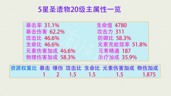 如20級聖遺物主屬性的攻擊百分比,拉滿為46.6%,暴擊率為31.1,符合暴擊:攻擊百分比=1:1.5。五星角色突破屬性為暴擊的最多加成有19.2%暴擊率,為攻擊百分比的則是28.8,同樣符合暴擊:攻擊百分比=1:1.5。