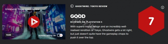 玩了20小時左右之後,IGN表示它的沉浸感很令人享受,城市中對於細節的注重令人佩服,讓人很樂於置身其中,能找到很多標誌性的日本文化傳說元素。