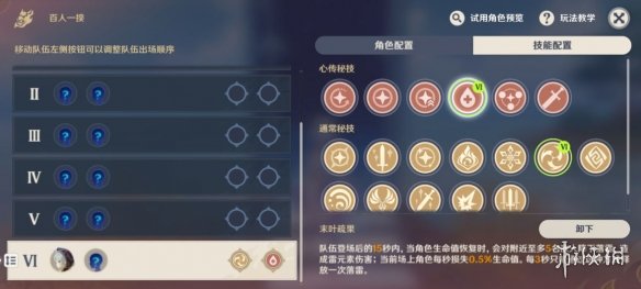 今天的怪是丘丘王血厚和有盾,所以只能速切還有注意丘丘王的攻擊,基本角色大招釋放完畢後即可切下一個。下面是人物順序和推薦技能。