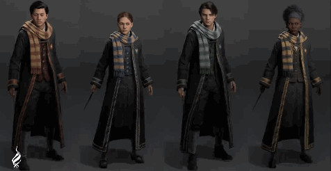 從GIF來看,服裝從左到右依次為:格蘭芬多(獅院)、拉文克勞(鷹院)、斯萊特林(蛇院)、赫奇帕奇(獾院)。