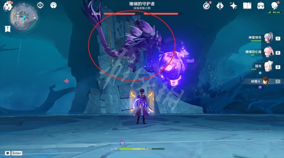 打深海龍蜥群boss,當龍蜥爬上石柱上,使用鍾離長e一下就可以擊落。