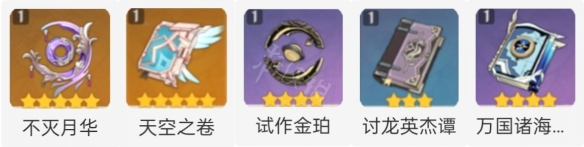 不滅月華:珊瑚宮心海專武,主詞條為生命值,武器面板提供治療加成,普通攻擊造成的傷害增加以及施放元素爆發後的普通攻擊命中敵人時恢復元素能量,通用性較低的武器,目前適合該武器的角色有珊瑚宮心海和芭芭拉。