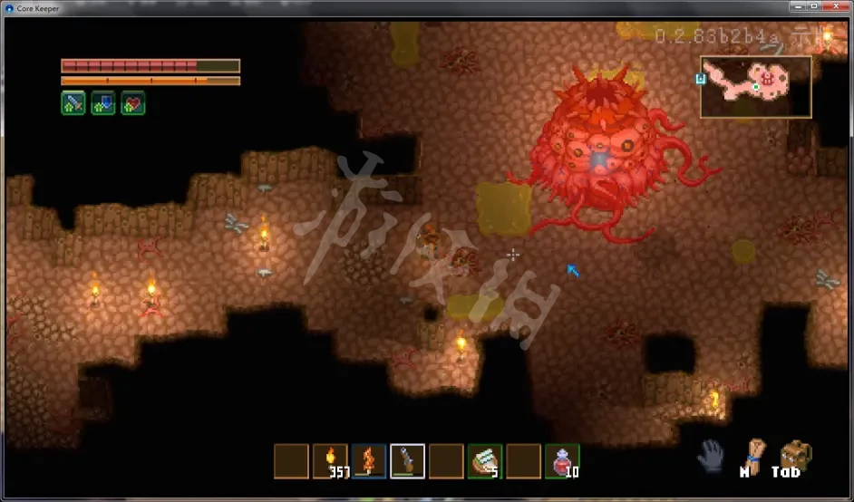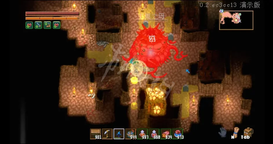 仔細觀察地面,有五個會釋放小怪的蟲洞,拿蟲巢牆壁將它圍住。蟲巢牆壁就在周圍,用炸藥炸兩三次就能破壞。即使用目前最好的鐵鎬也得挖很久,耗損太大,不推薦。
