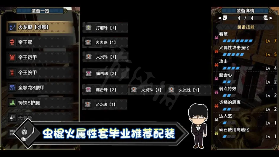 弱點特效2:配合S2的位置,可以將炎王手換成火龍手,優先弱點特效+3,多餘的位置優先超會心>看破>攻擊>達人藝。