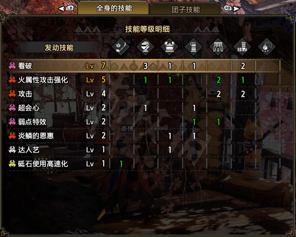 技能:看破7,火屬性5,攻擊4,超會心2,弱點特效2,炎鱗2,達人藝1,砥石高速化1。