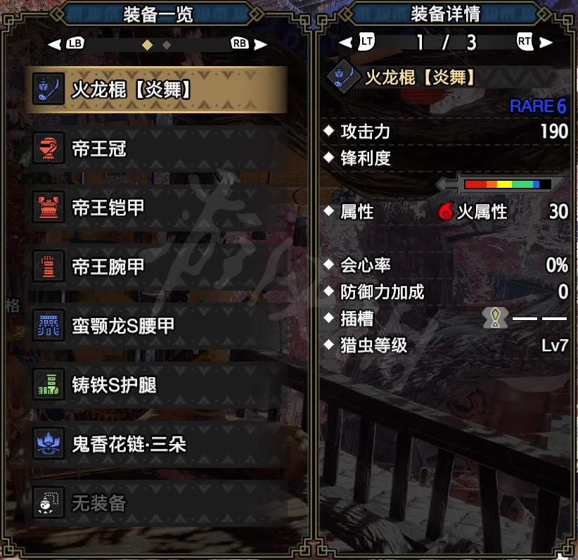 接下來說下配裝思路,由於火龍棍會心率0%,所以只能從珠子護石和防具上獲取會心率屬性,配裝方面優先會心率>會心傷害>攻擊,當然這是純個人見解,沒有什麼專業認證的說明,無護石狀態下,弱點特效+看破7有效部位也能達到70%的會心。所以在護石方面最簡單的方法就是再出一個痛擊珠的收益,那就可以直接達到90%的會心率,非常直觀的提升。
