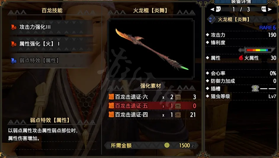 優點:火屬性相對較高,會心率0%,190的攻擊中等偏上,獵蟲等級7。