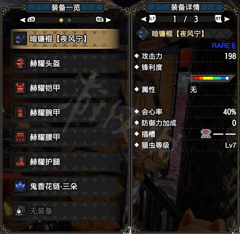 技能:攻擊7,看破7,超會心3,砥石高速化3,昏厥耐性3
