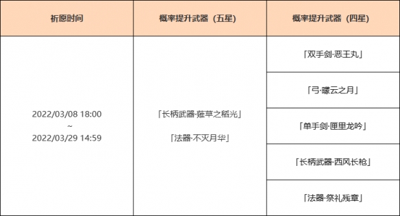 活動期間,限定五星武器「長柄武器·薙草之稻光」「法器·不滅月華」的祈願獲取概率將大幅提升!
