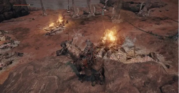 如果大家想在初期刷盧恩,我也有一個非常推薦的好去處。如果你在「蓋利德」地區的最南端找到了下圖中的「不破大橋」,那就朝下圖中左邊的方向走,不遠處你就能看到幾隊士兵在與恐龍狗一樣的怪物戰鬥。我們需要做的就是騎著馬坐山觀虎鬥,不管士兵死亡還是怪獸死亡,我們都會得到盧恩。