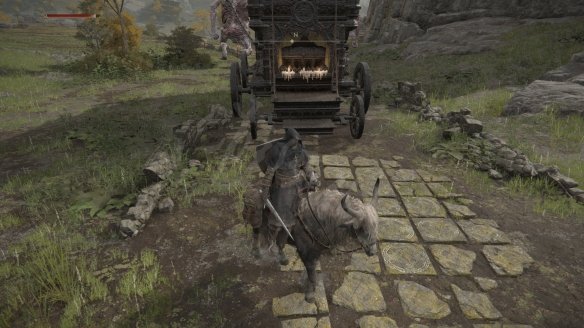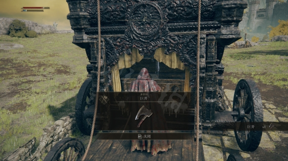 玩家剛到達城外的營地後,從城的反方向走,可以看到一座橋,過了橋就會看到有兩個巨人拉著一座轎子,我們的巨斧就在這個轎子後面。