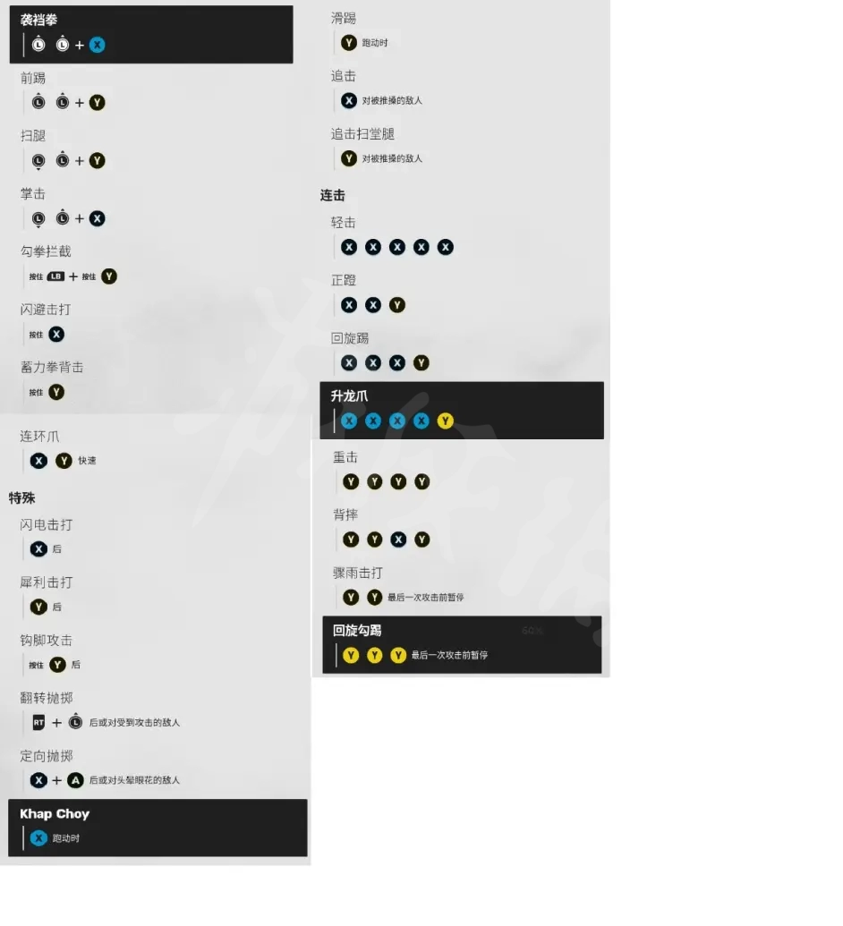 2、【Y鍵】——Y、長按Y(蓄力拳背擊)、下上Y(掃腿)、上上Y(前踢)、格擋後Y(犀利打擊)、奔跑時Y(滑踢)、對被推搡敵人Y(追擊掃堂腿)
