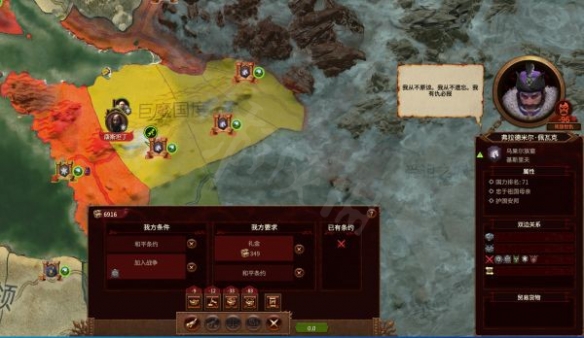 我們等羅普斯滿氏族軍隊全滅的時候即可無條件合幫其實這時候我一座城都沒有,是靠著和他防禦同盟待在他的領地里苟活。