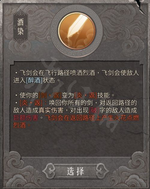 當玩家選擇酒染流派時,飛劍會在沿途噴灑烈酒,並且飛劍會使敵人進入醉酒狀態。