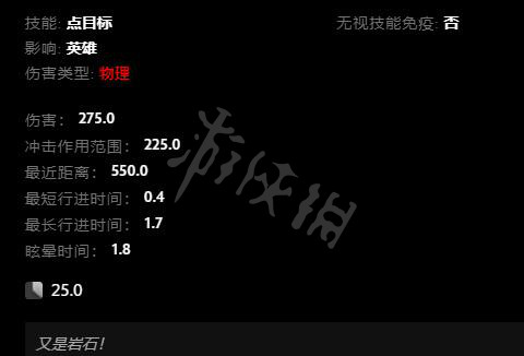 獸向目標地點扔出一塊岩石,對敵人造成眩暈和傷害。岩石無法扔向獸身邊的最小范圍內