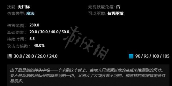 獸踐踏一切。每行進140.0距離就會對獸附近范圍內所有敵人造成傷害。傷害量為基礎傷害加上獸攻擊力的一定倍數。獸在技能期間被繳械。