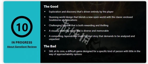 探索和發現完全由玩家驅動。令人驚嘆的游戲世界設計,將全新的開放世界和經典的封閉式魂系列地圖風格融為一體。充滿挑戰的戰斗,既有豐厚獎勵又刺激。視覺上令人驚嘆的游戲世界,多樣化且令人難忘引人入勝的、有層次感的、多面的故事,需要(玩家)分析和解讀。盡管如此,究其核心而言仍然是一款為特定類型玩家設計的高難度游戲,幾乎沒有平易近人的難度選項。