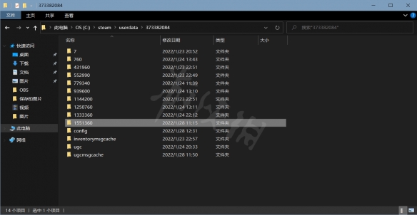 然後將steam退出,找到你的steam文件夾(可以在桌面steam圖標右鍵-打開文件所在位置),點userdata,進去後會看到若幹個數字名字的文件夾,一般是點第一個,進去後會看到一個叫1551360的文件夾,這個就是地平線5的本地存檔位置,如圖。