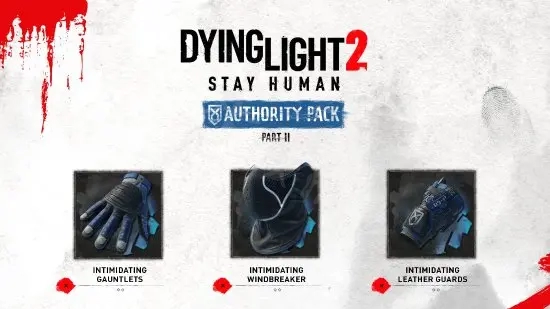 “震懾包”是消光2的免費服裝DLC,以游戲中維護法律和秩序的維和者派系制服為主題,由3部分組成,第一部分包括戰術性防風衣和時髦的運動休閑服與運動鞋,第二部分包括腕帶、手套和一個面罩,第三部分則是一個戰斗用的鎚子。