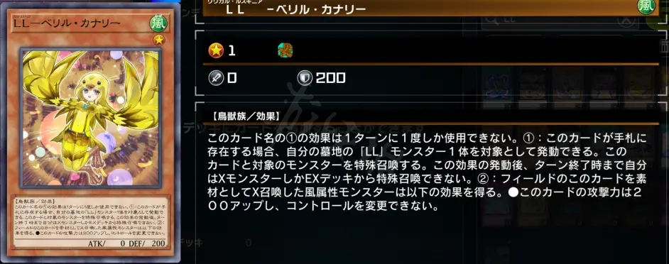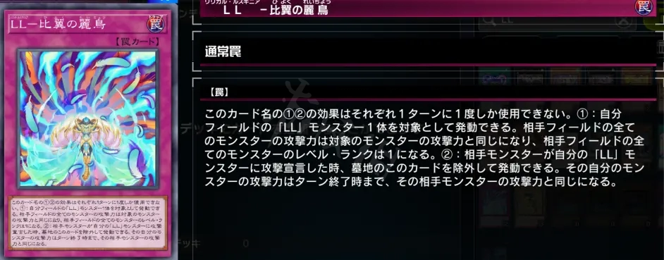 效果:這個卡名的①②效果1回合各能使用1次。①:這張卡特殊召喚成功的場合可以發動。從卡組將1張「 LL 」魔法陷阱卡加入手牌。②:這張卡在墓地存在的場合,可以以自己場上的1隻「 LL 」多維怪獸為對象發動。將這張卡疊放在那隻怪獸下面作為多維素材。