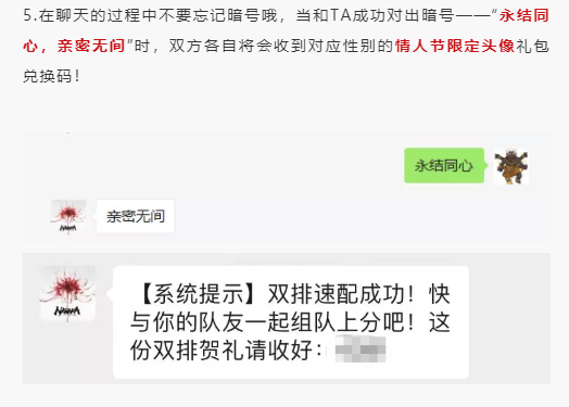 本次更新後,天選之人雙排模式將同步開啟!為了讓大家能更方便地找到雙排隊友,2月14日12:00-2月22日24:00期間,《永劫無間》官方微信公眾號限時開啟聚窟洲雙排速配活動,成功匹配且喊對口號的兩個人更可以獲得情人節頭像兌換碼。