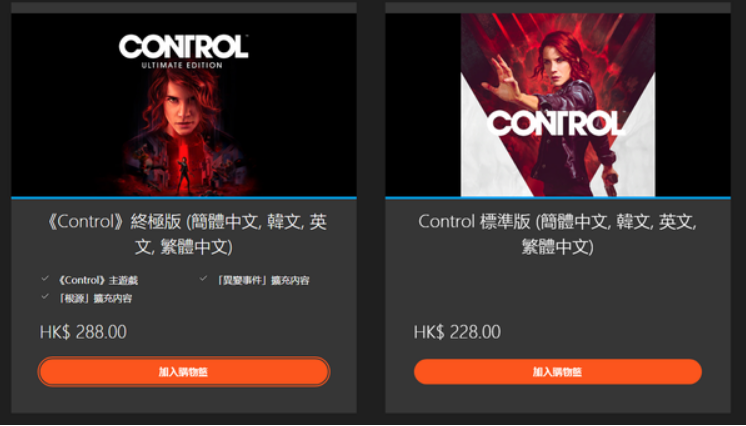 本次發行的《控制》終極版包含了遊戲的一般版,DLC《根源》和DLC《異變事件》。另外,終極版還新添加了輔助模式,玩家可以通過調高遊戲數值來更好地欣賞遊戲劇情。本作售價為243元。