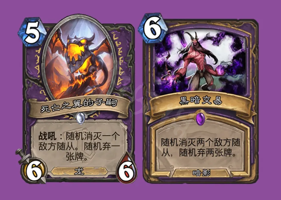 死亡之翼的子嗣,術士普通隨從,5費6攻6血的龍,戰吼:隨機消滅一個敵方隨從,隨機棄一張牌。棄牌術的最後一張碎片,不愧是大表哥的子嗣。獵人缺解,所以致射龍很強,但術士不缺解。強的棄牌組件要麼費用低,就像魂火,要麼定向棄牌,比如夜影主母,5費在寶寶術里已經算是高費了。