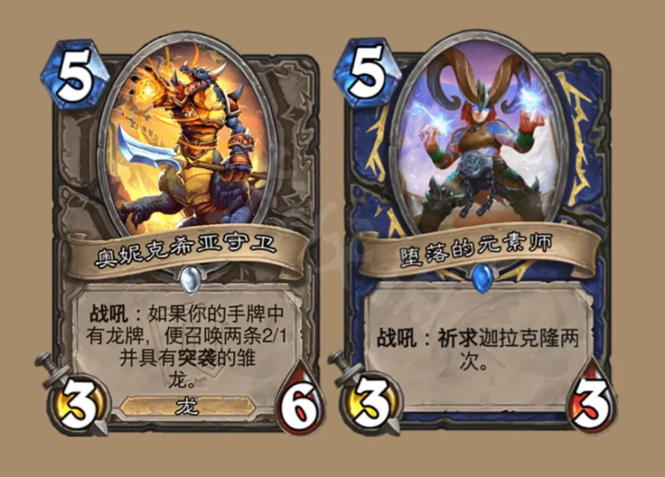 奧妮克希亞守衛,中立普通隨從,5費3攻6血的龍,戰吼:如果你的手裡有龍牌,就召喚2條2攻1血並具有突襲的雛龍。參考祈求薩的墮落元素師,有點強,不過現在的天梯還能用2年前的模型來衡量嗎?龍體系能與祈求體系相提並論嗎?看後面有沒有像重拳那樣離譜的核心龍吧。