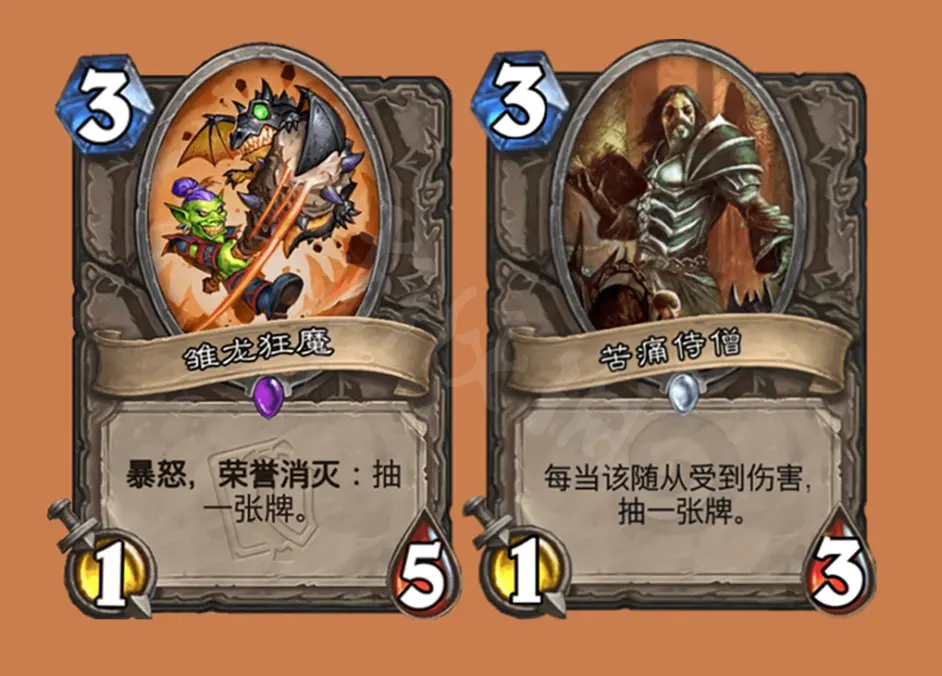 雛龍狂魔,中立史詩隨從,3費1攻5血,暴怒、榮譽消滅:抽1張牌。低配苦痛侍僧,高配詹姆斯,3費很難一次性解掉5血怪,公雞小魚怪應該能穩定觸發,下限過一張,上限過6張也不是不可能,比如單殺獵人的一地11。有蜂群來襲的小德應該看不上這種需要配合的過牌。