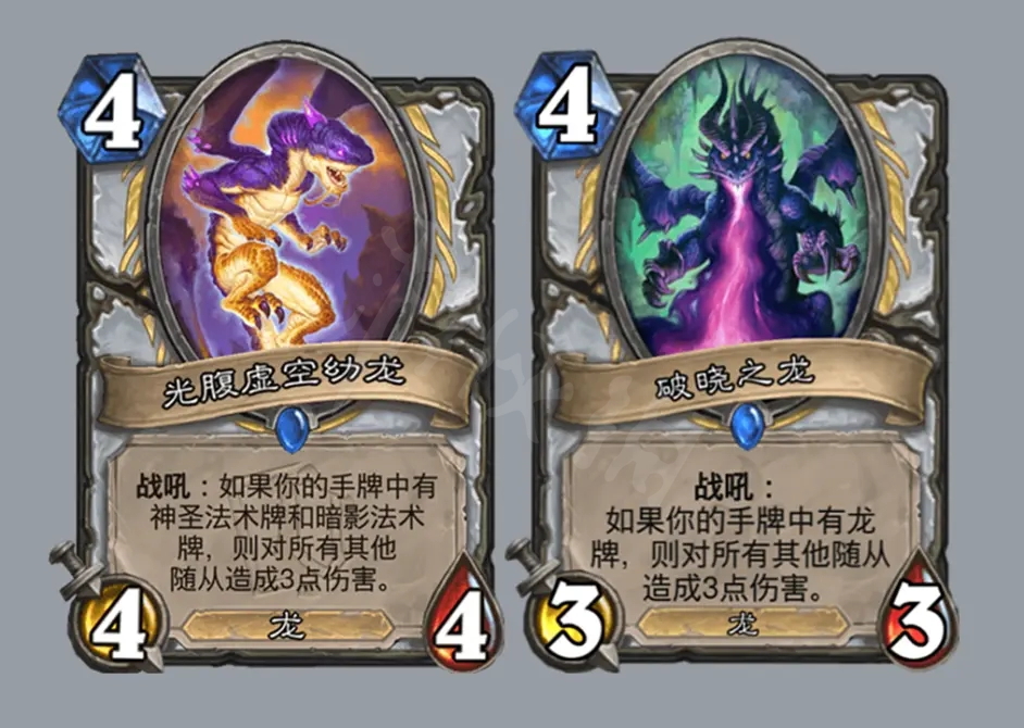 光腹虛空幼龍,牧師稀有隨從,4費4攻4血的龍,戰吼:如果你的手裡有神聖法術牌和暗影法術牌,就對所有其他隨從造成3點傷害。對比破曉之龍,我們就叫它大破龍好了。配合靈魂向導?集齊光暗法術沒那麼難,牧師法術多得很,還有復甦、暗中生長、熊貓人、魔蠍、解說手相等發現。好卡,牧師就缺前期小AOE。