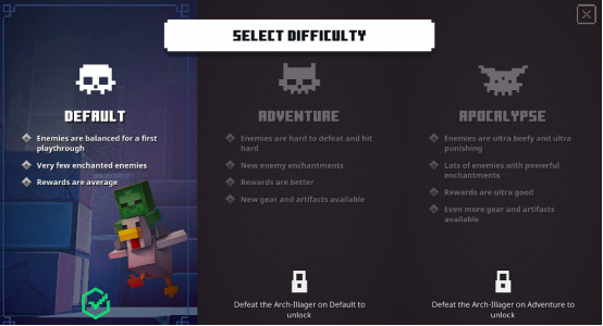 為了照顧不同玩家的需求,《我的世界:地下城》提供了不同難度的選擇:入門者、冒險者以及天啟難度。